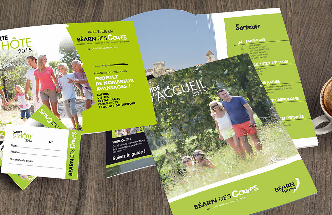 Mise en page du guide d'accueil en français, anglais et espagnol, ainsi que la brochure carte d'hôte en fonction de la charte graphique du comité départemental de tourisme
