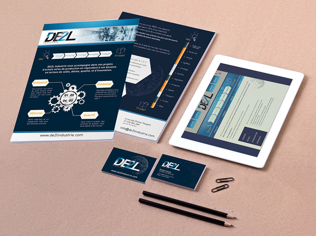 Conception de la plaquette descriptive de la société, des cartes commerciales, du catalogue produits, et du webdesign
