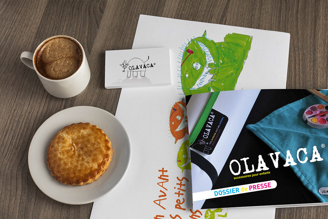 Conception et impression d'un dossier de presse, format livret A5 paysage. Retouche des dessins des enfants, mise au format pour la création de trousses, sacs et autres accessoires enfantins