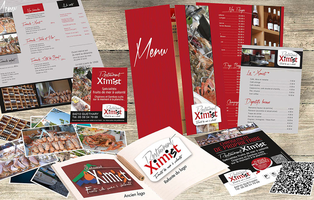 Refonte du logo, création des cartes des menus, prises de vue, prospectus annonçant le changement de propriétaire, QR code, annonce dans journaux, tableaux en plexi transparent pour décoration du restaurant...