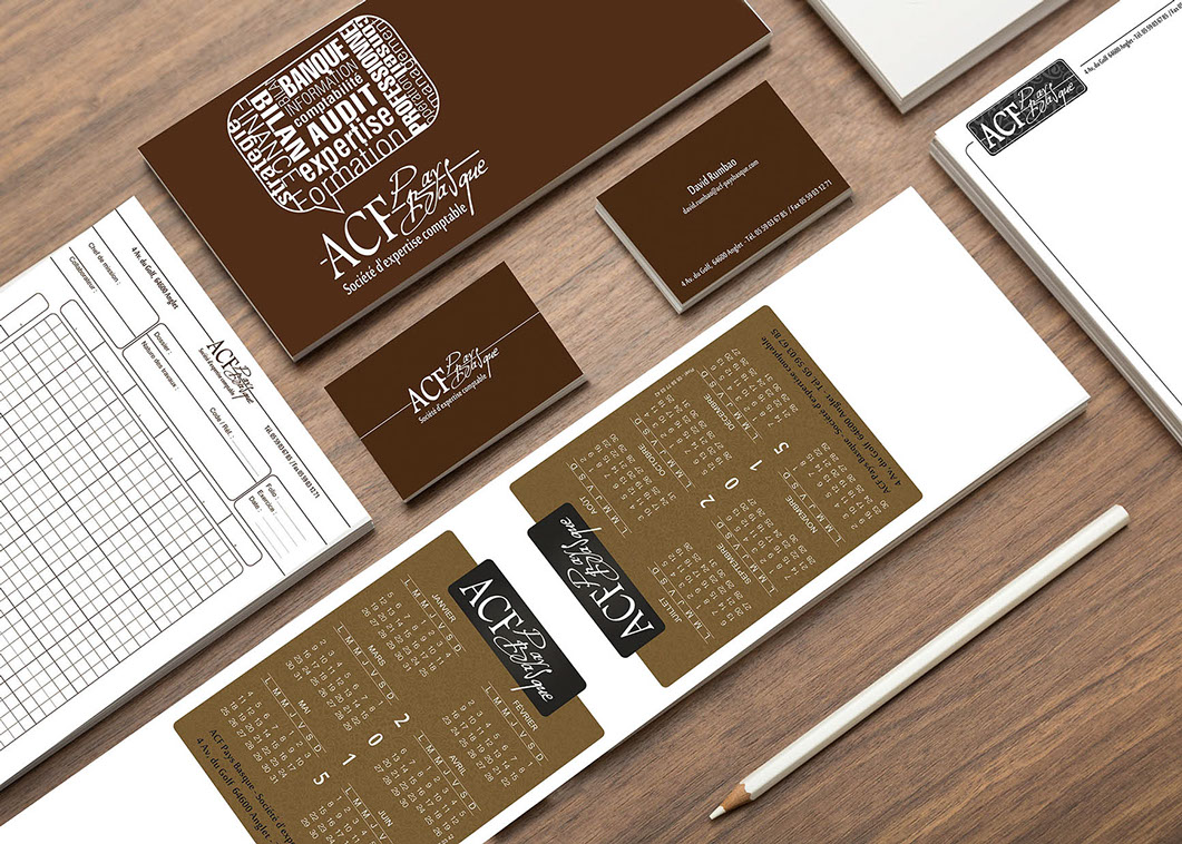Conception du logo et des différents supports de communication (cartes commerciales, calendriers, blocs compta, sacs publicitaires, roll up, invitations, cartons de correspondance...), impression