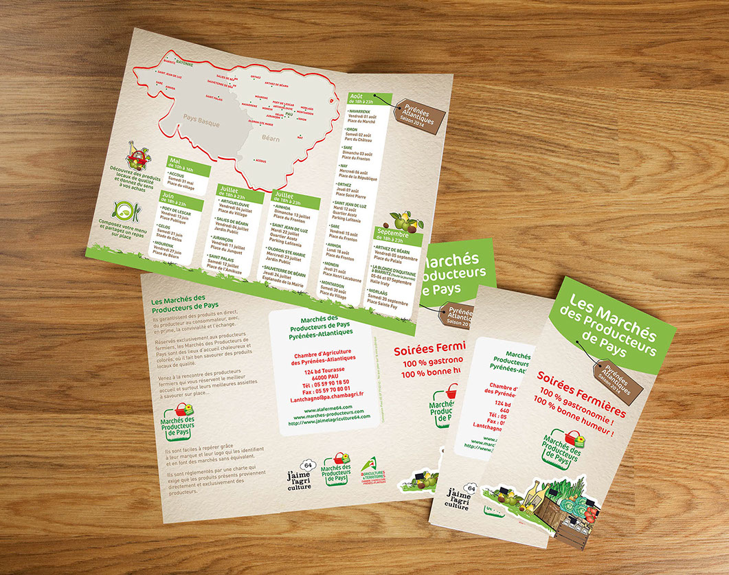 Conception d'un dépliant générique annonçant tous les marchés des producteurs de pays en complément d'un prospectus pour chaque ville participant à cette opération (environ 25 villes; Bayonne, Oloron, Mourenx, Poey de Lescar, Navarrenx, Nay... )