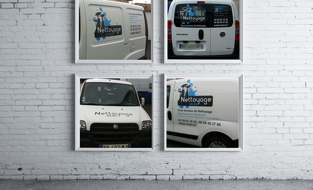Marquage de la flotte des véhicules suivant le logo crée précédemment, conception de supports de communication (cartes commerciales, tampon, tête de lettre) décoration du magasin, enseigne, marquage t.shirts, impression