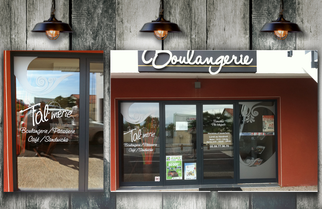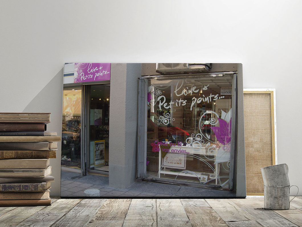 Décoration de la vitrine du magasin suivant l'identité visuelle mise en place pour les cartes commerciales, tampon, et autocollants, impression