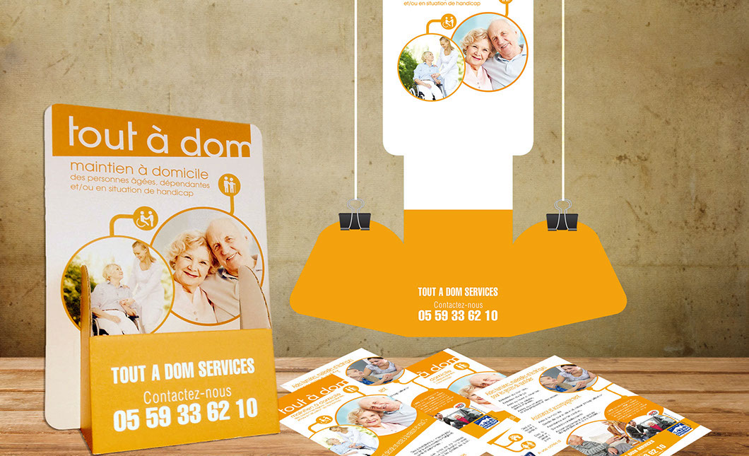 Conception d'un prospectus portant sur le maintien de la personne à domicile et de son présentoir, fabrication et impression