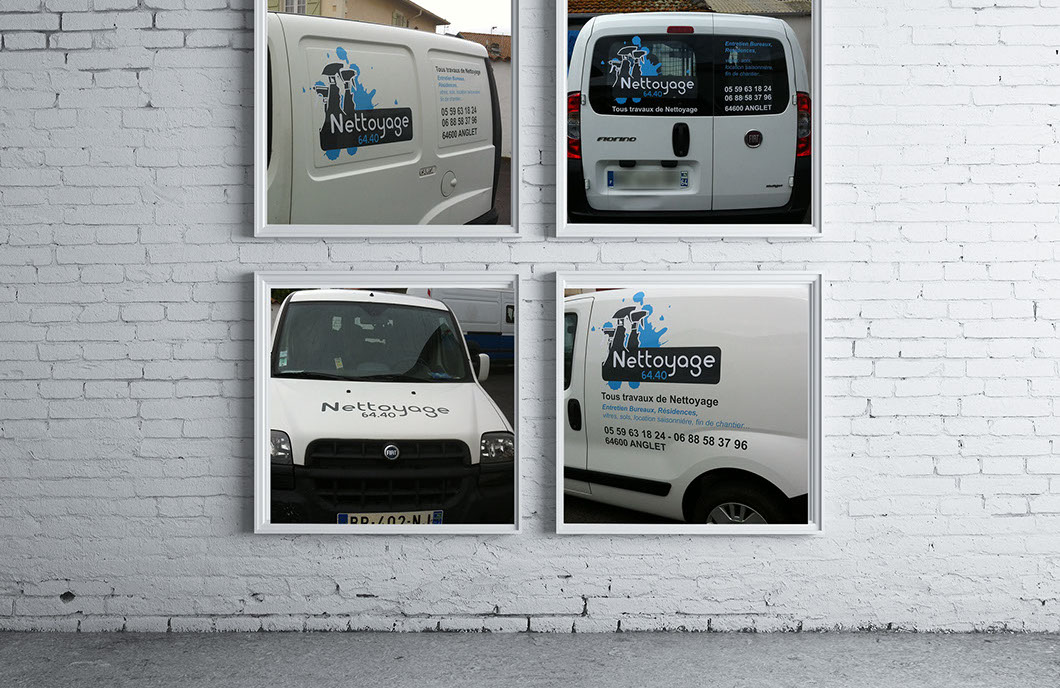 Marquage de la flotte des véhicules suivant le logo crée précédemment, conception de supports de communication (cartes commerciales, tampon, tête de lettre) décoration du magasin, enseigne, marquage t.shirts, impression