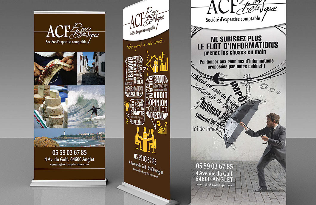 Conception du logo et des différents supports de communication (cartes commerciales, calendriers, blocs compta, sacs publicitaires, roll up, invitations, cartons de correspondance...), impression