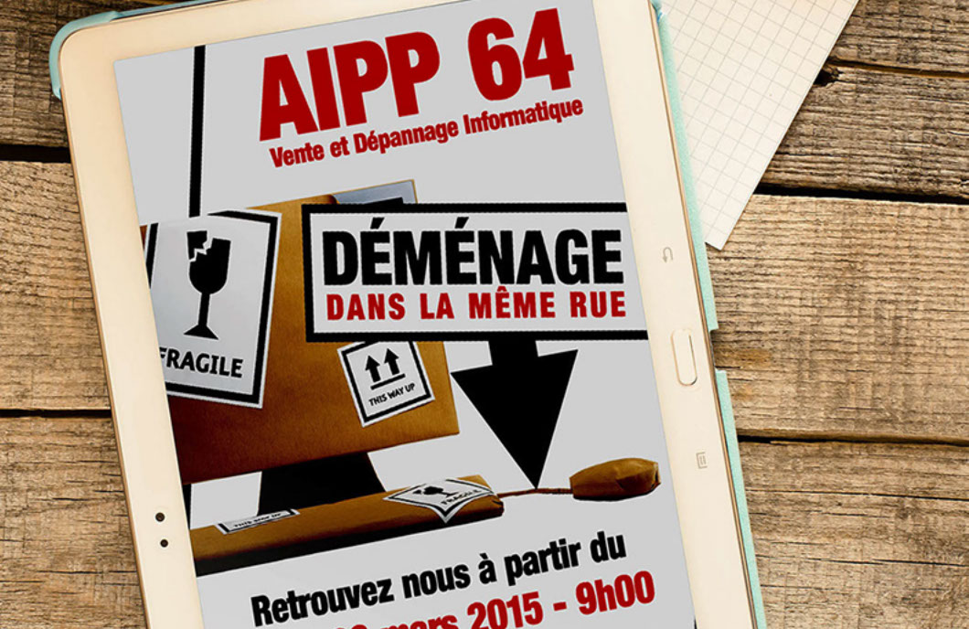 Conception d'une newsletter annonçant le déménagement de la structure. Décoration du nouveau magasin, cartes commerciales, autocollants...