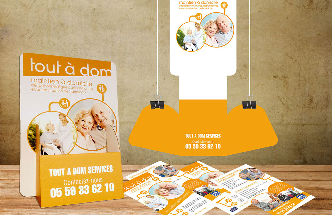 Conception d'un prospectus portant sur le maintien de la personne à domicile et de son présentoir, fabrication et impression