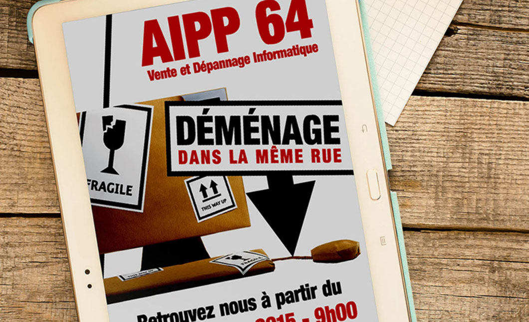 Conception d'une newsletter annonçant le déménagement de la structure. Décoration du nouveau magasin, cartes commerciales, autocollants...